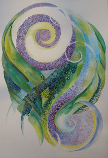 If you scroll down slightly, you'll see the beginning of this abstract painting. Here is what I've continued doing in the past few days. Its coming along, however with such meticulous work, it takes time to get coverage! I'm happy with the lyrical colors and the general "feel" of the overall painting.